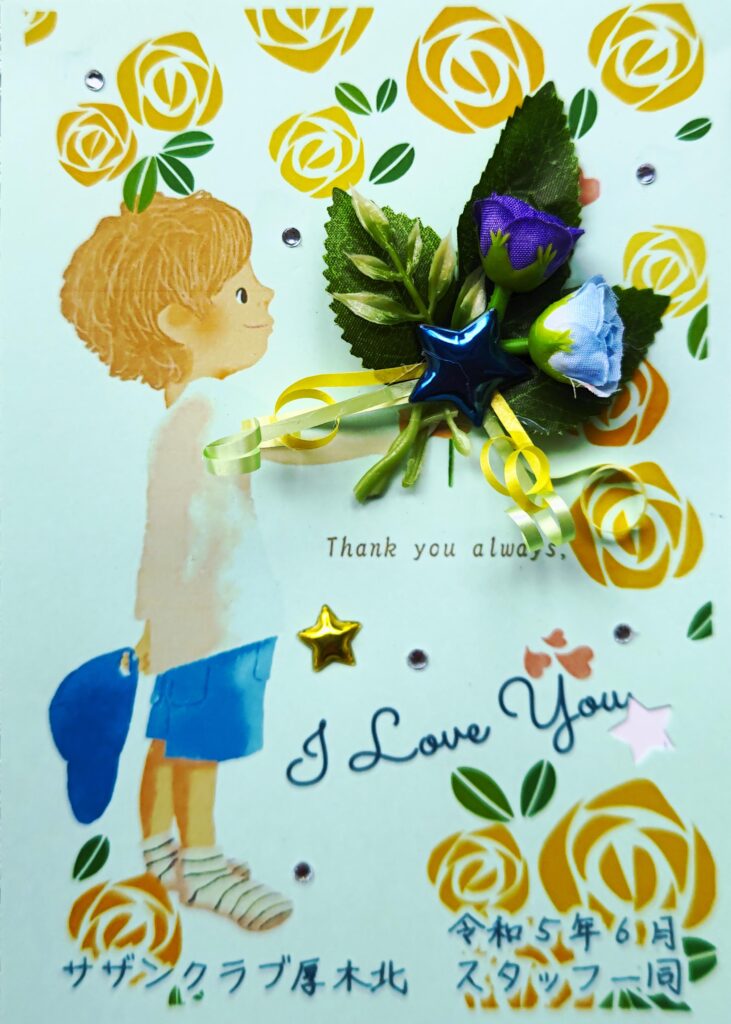 六月、父の日の前の週に、日頃の感謝を込めて、サザンクラブの男性利用者様に、スタッフからお祝いカードと「道標」という歌をプレゼントさせて頂きました。サザンご利用の男性の皆様は、いつも優しく、ジェントルマンの方ばかりです! これからも男らしい素敵な笑顔で、サザンクラブに沢山のダンディな花を咲かせてください。