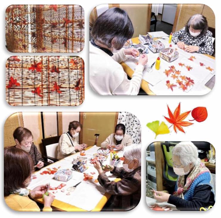 今月のクラフトでは、秋の彩りを感じられる「吊り紅葉」を制作しました。トイレットペーパーの芯にお花紙を貼りつけ、紅葉の形に折ったり切ったりしながら、皆さんで協力して仕上げました。光を通すお花紙は、日差しを受けると透けるように色づき、とても美しく、まるで窓辺に小さな秋が訪れたようです。完成した吊り紅葉は、風が吹くたびにゆらゆら揺れ、ひとつひとつ異なる表情を見せてくれます。「かわいいね」「家にも飾りたい」と嬉しい声も多く、手作りならではの温かさが感じられる素敵な作品となりました。