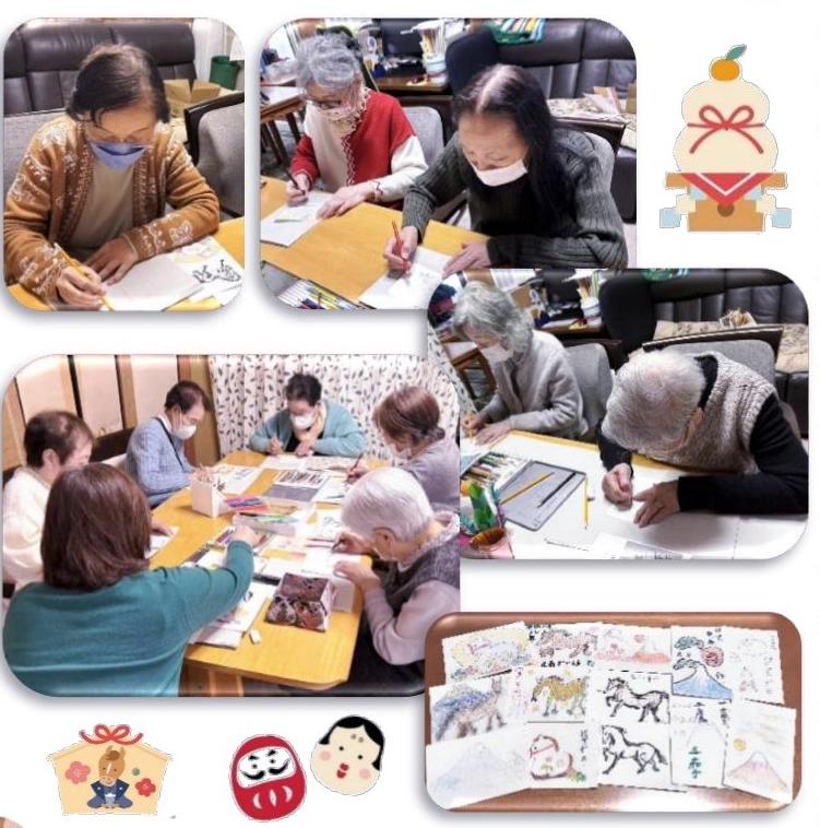 今月の制作活動では、絵手紙づくりに取り組みました。ゆっくりと線を引きながら、皆様それぞれが思い思いの題材を描いていきました。縁起の良い干支の「午」や、日本を象徴する富士山を選ばれる方が多く、勢いのある筆運びや、のびやかな構図が印象的でした。色づかいにも個性が表れ、「この色がきれいね」「昔、富士山を見に行ったことがあるよ」と、思い出話に花が咲く場面も。完成した絵手紙はどれも味わい深く、描く方の気持ちや人柄が感じられる作品ばかりでした。集中しながらも、穏やかで温かな時間となりました。