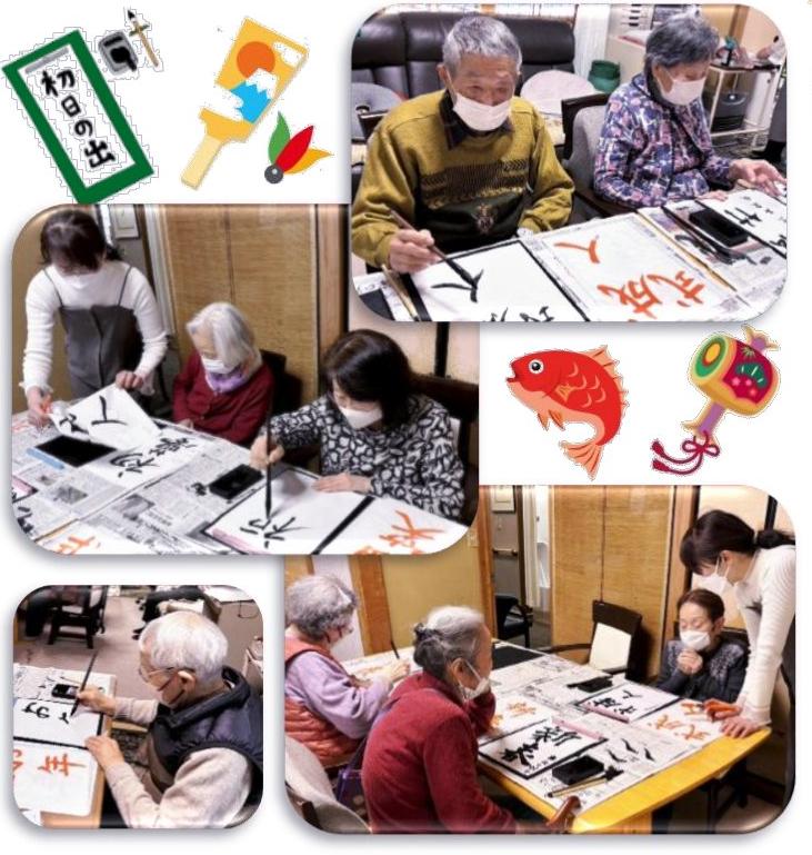 ササザンクラブでは、毎週の活動として習字に取り組んでいますが、新年最初の回は「書き初め」として、いつもより少し特別な気持ちで筆を持ちました。「初春」「初夢」「松竹梅」など、縁起の良い言葉を選び、一画一画を丁寧に書き進める皆様の表情は真剣そのもの。習字は、指先や腕を使うことで身体機能の維持につながるだけでなく、文字を思い出し構成を考えることで脳への良い刺激にもなります。また、筆を運ぶ動作は呼吸を整え、心を落ち着かせる効果もあります。新年の始まりにふさわしい、心静かで実りある時間となりました。