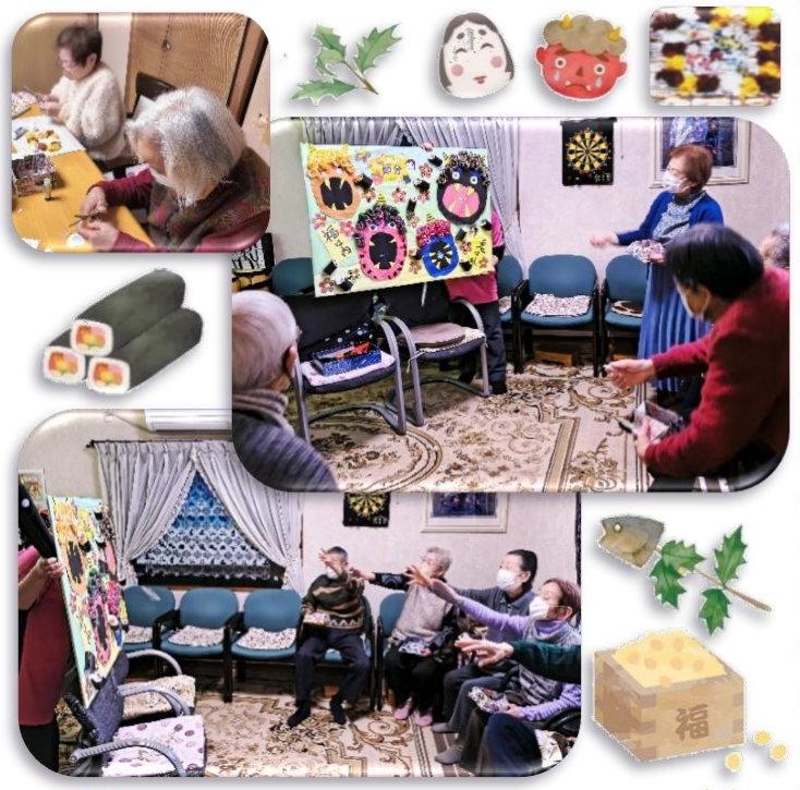 節分に合わせて、豆まきを行いました。鬼ボードに向かって、「鬼は外、福は内」と元気な掛け声が響き、皆様、楽しそうに豆まきに参加しました。周りの声に背中を押されながら、しっかりと鬼退治をされる姿も見られ、にぎやかな時間となりました。また、クラフトの時間には、お花紙を使った節分の壁掛け飾り作りを行いました。紙を丸めたり貼ったりと手先を使いながら、皆様で相談し合い、それぞれ個性あふれる作品が完成しました。体を動かし、手を動かし、季節行事を存分に楽しむ節分となりました。今年も皆様にたくさんの福が訪れますよう願っています。